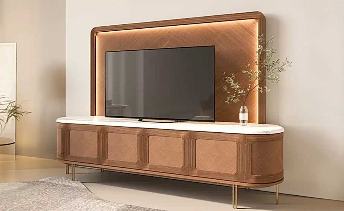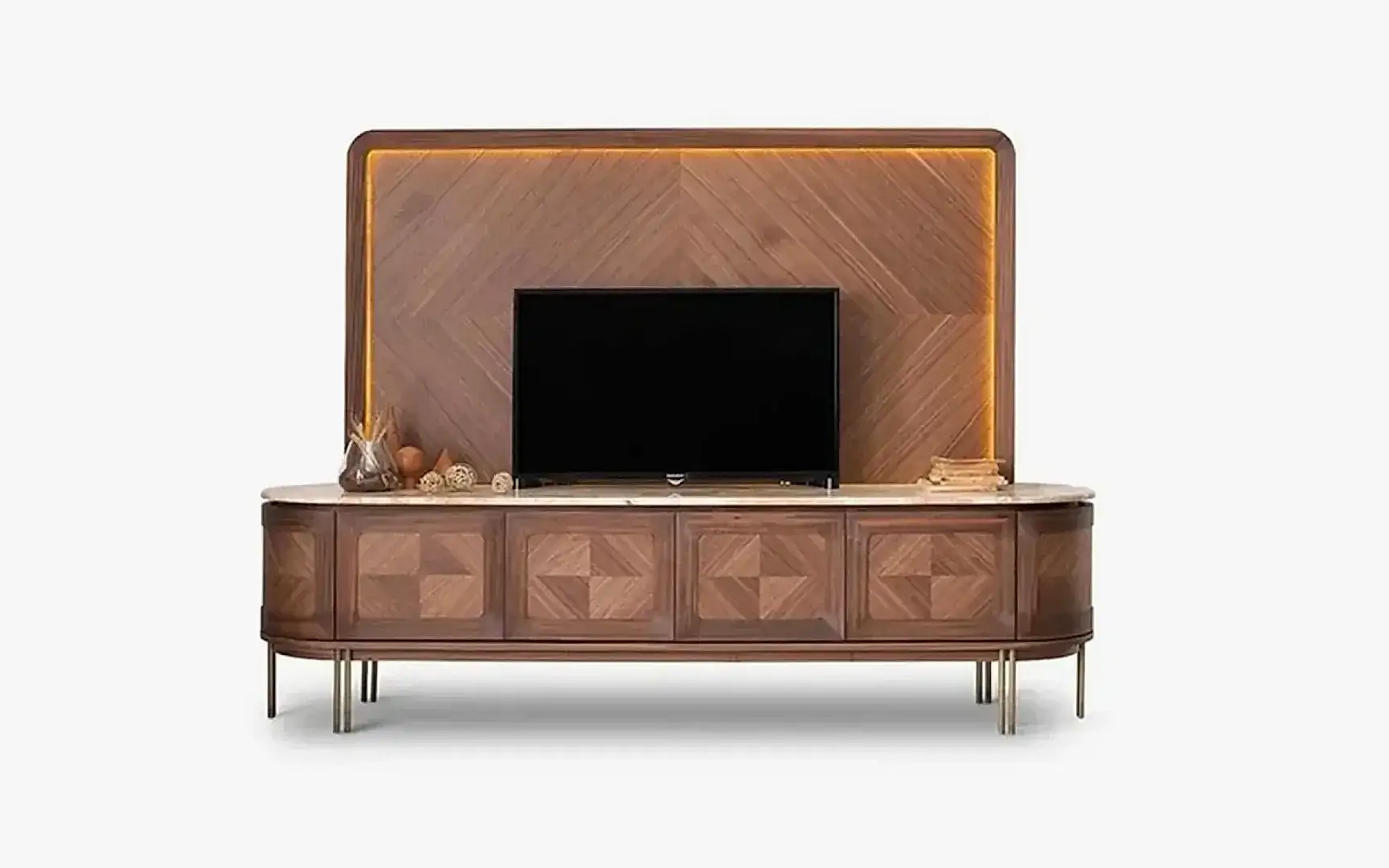 İnce estetik anlayışının yanı sıra fonksiyonel yönüyle de şaşırtıcı bir etki bırakan Eva TV Ünitesi, mermer,ahşap ve pirinç üçlemesini bu tasarımda da bir yıldıza dönüştürüyor.